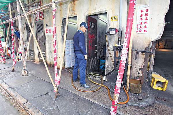 消防處署理助理消防區長(危險品課)王坦表示,處方早前接到市民舉報,懷疑有人在葵涌永立街一工業大廈經營非法油站,打擊非法燃油專隊人員經調查後,昨晨九時聯同海關人員突擊搜查目標工廈的一個地下單位,拘捕一名正為門外客貨車加油的約40歲女子,又在內裏多個「骰仔缸」內檢獲約400升油渣。