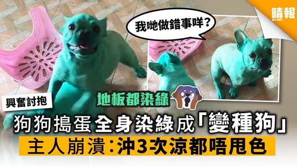 狗狗搗蛋全身染綠成「變種狗」 主人崩潰:沖3次涼都唔甩色
