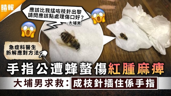 被蜂針傷|手指公遭蜂螫傷紅腫麻痺 大埔男求救:成枝針插住係手指【附醫生專業意見】