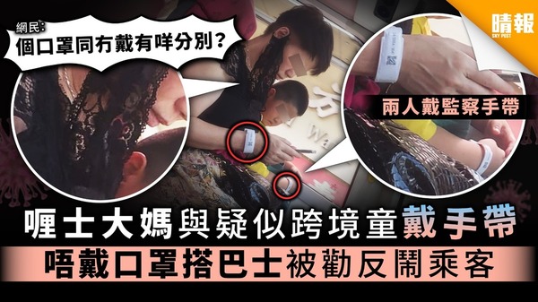 【隔離檢疫令】喱士大媽帶疑似跨境童戴手帶 唔戴口罩搭巴士被勸反鬧乘客